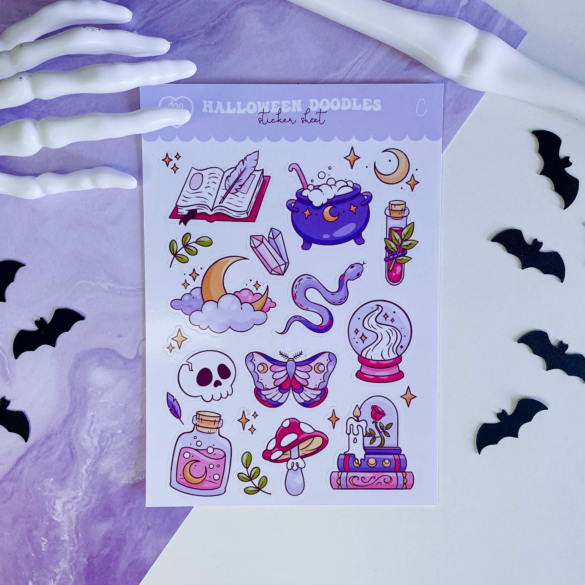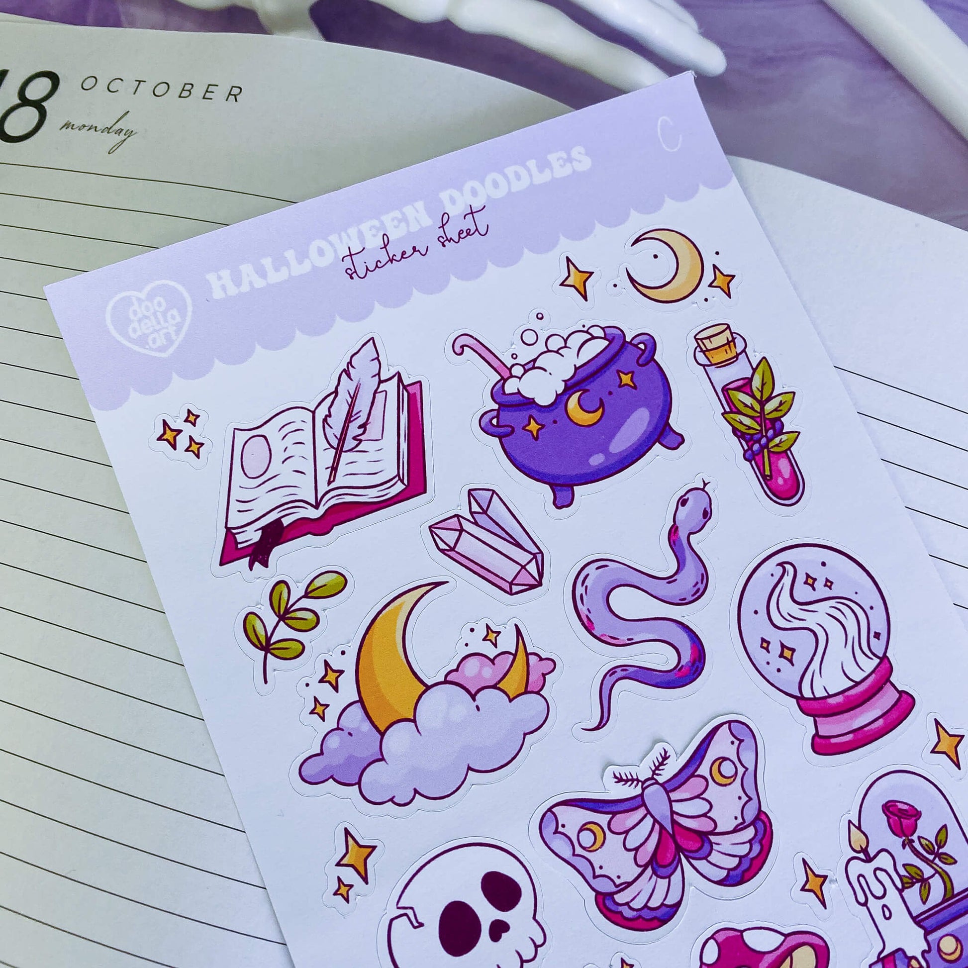 This cute sticker sheet features delightful collection of various adorable and charming halloween and all things witchy designs in pastel goth style, perfect for adding a touch of spookiness to your planners, journals, scrapbooks, and crafts. With an array of whimsical characters and illustrations, this sticker sheet offer endless possibilities for creative expression and personalization.