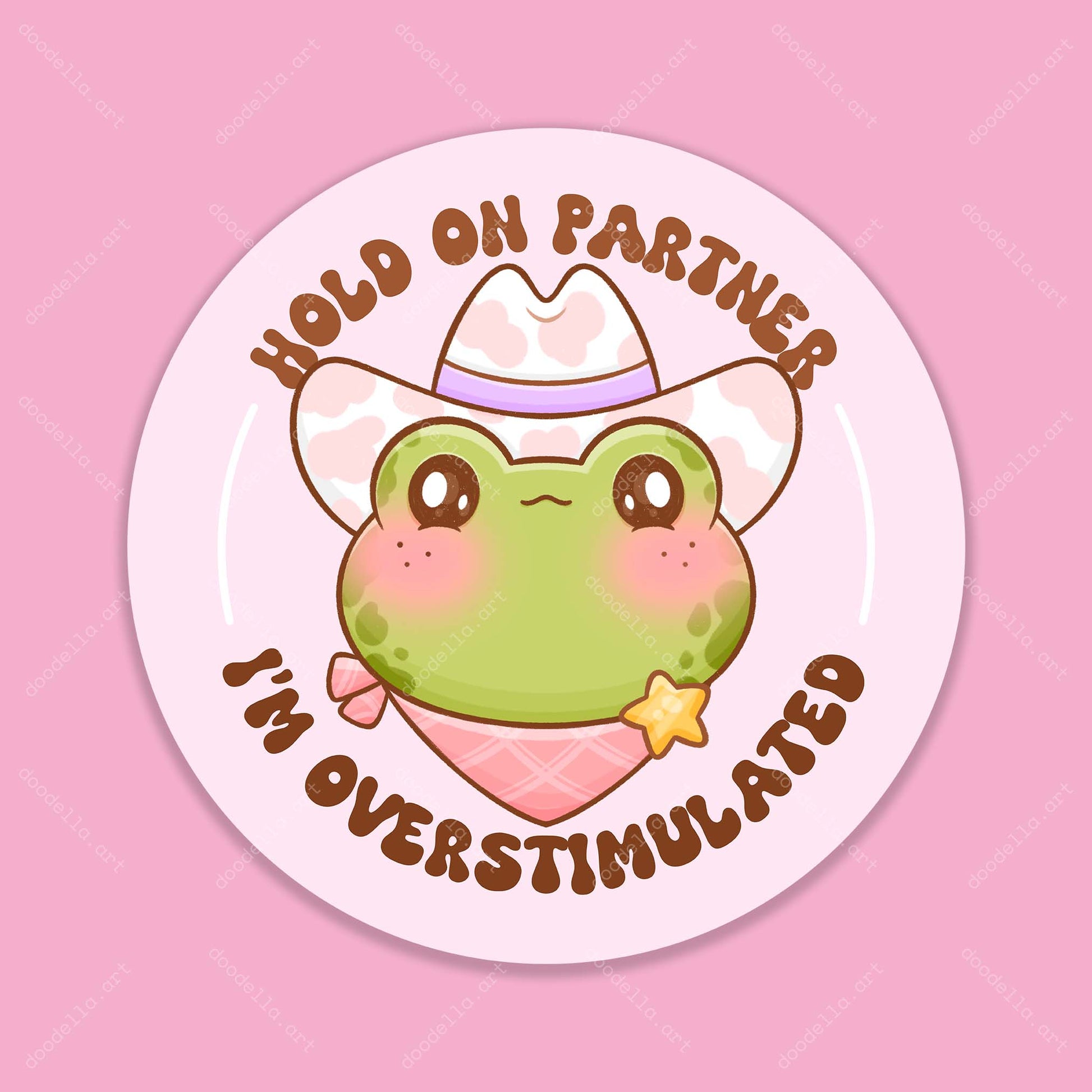 Embrace the chaos with this *Hold On Partner, I Am Overstimulated* cowboy frog sticker—perfect for those who get overwhelmed but keep riding through life no matter what.