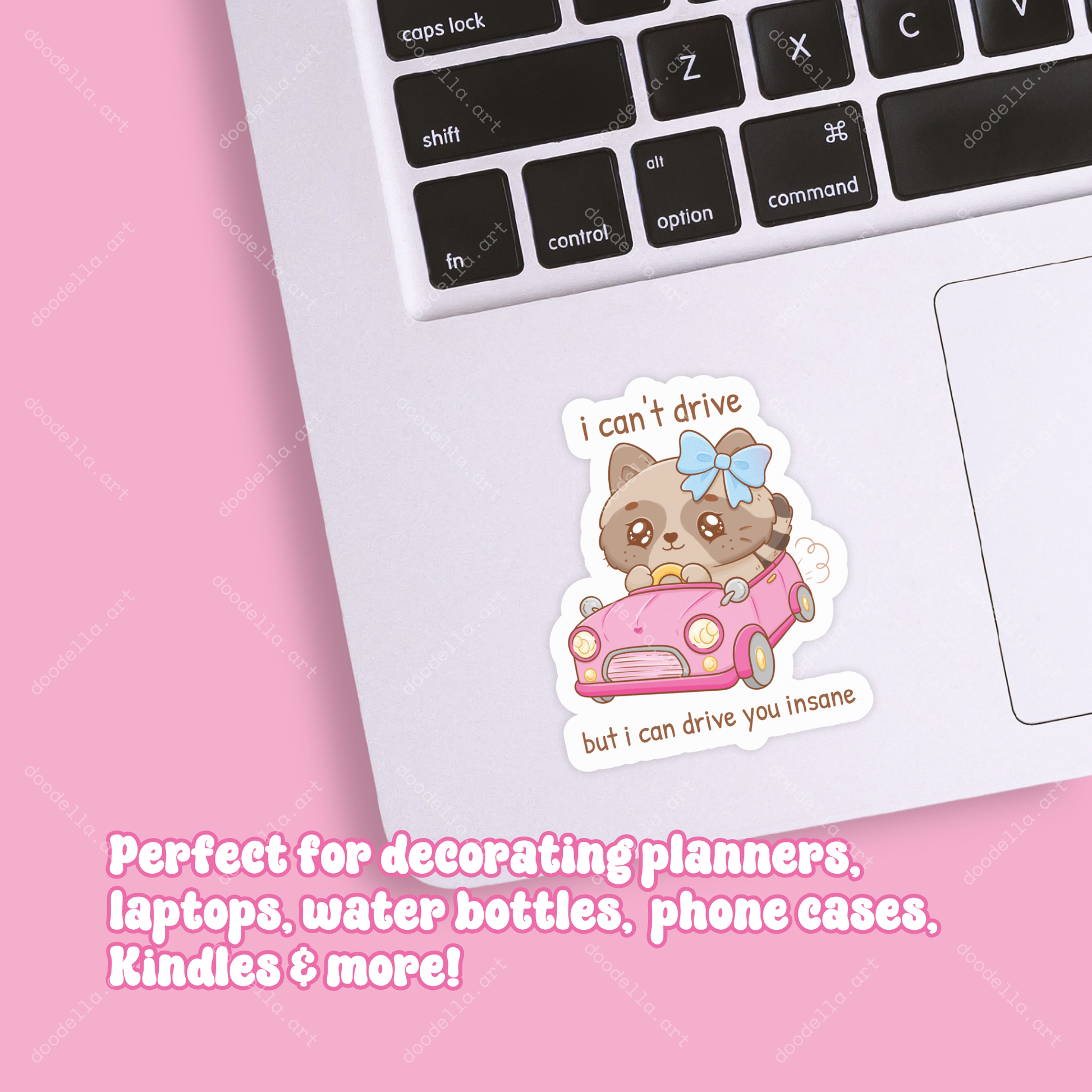Bring the chaos with this sticker, featuring a cute raccoon behind the wheel—perfect for adding funny, unhinged energy to your laptop, journal, or water bottle with this handmade, relatable design!