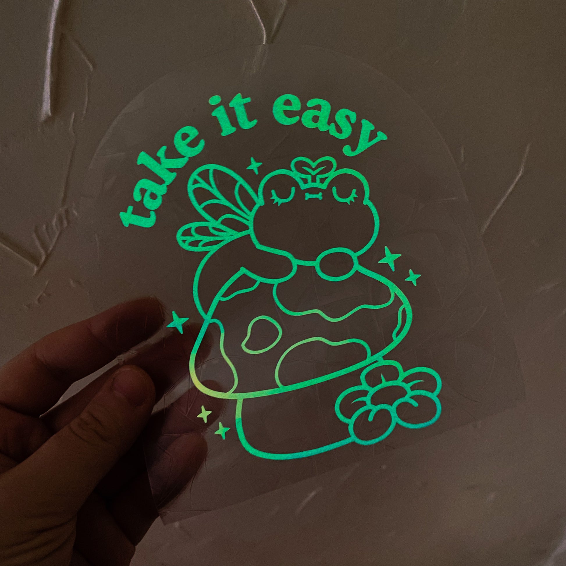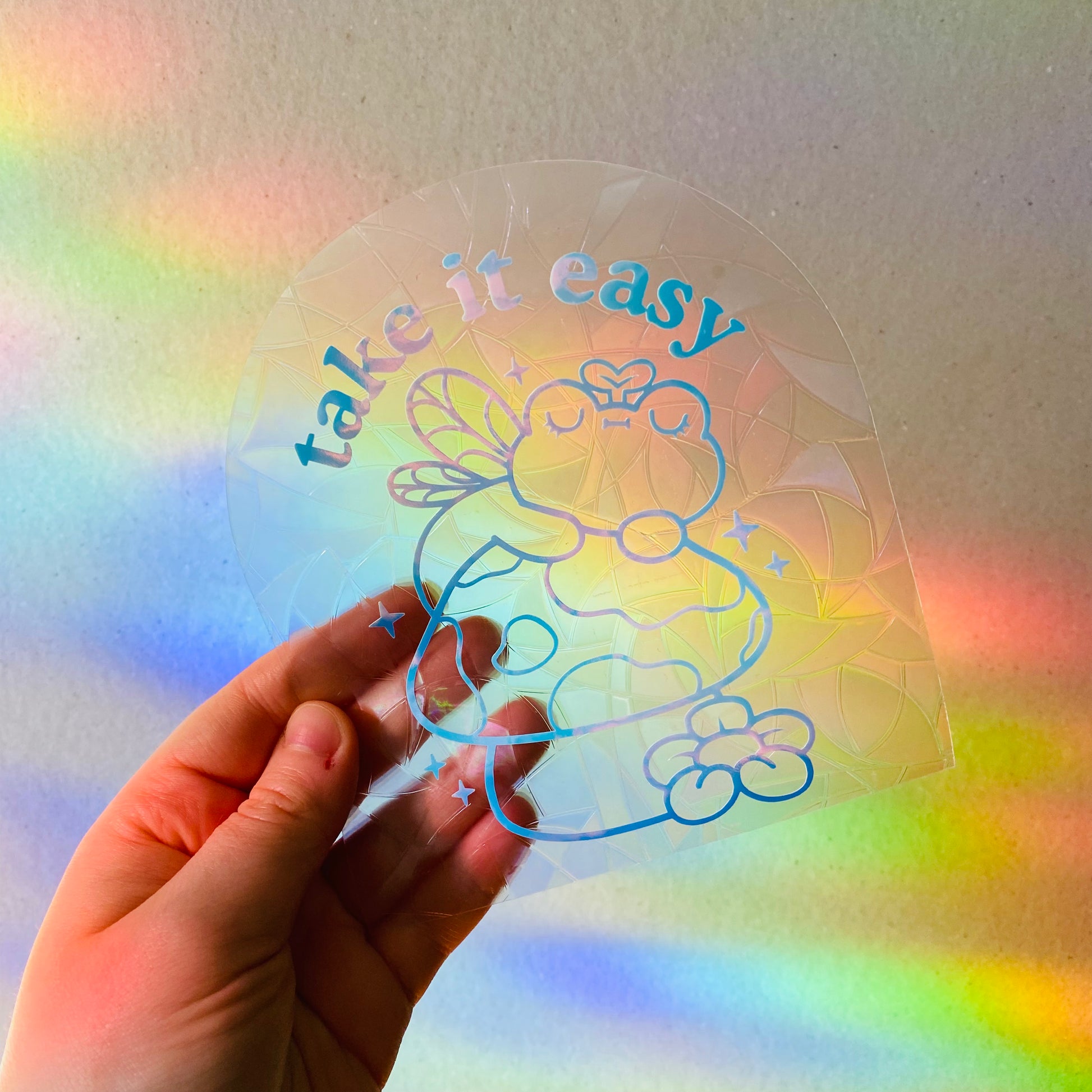 Bring more joy and color to your space with this magical rainbow maker sticker! This sun catcher makes beautiful rainbows if placed on your window in sunlight. This decal features a cute frog fairy perched up and taking a nap on a mushroom. Not only does this sticker make rainbows, but it also glows in the dark!