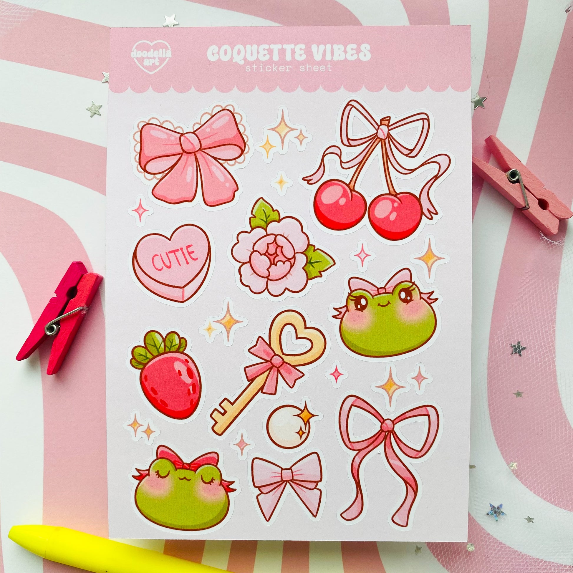 This cute sticker sheet features a delightful collection of various adorable and charming coquette doodles, perfect for adding a touch of girly charm to your planners, journals, scrapbooks, and crafts. With an array of whimsical illustrations, this sticker sheet offers endless possibilities for creative expression and personalization.