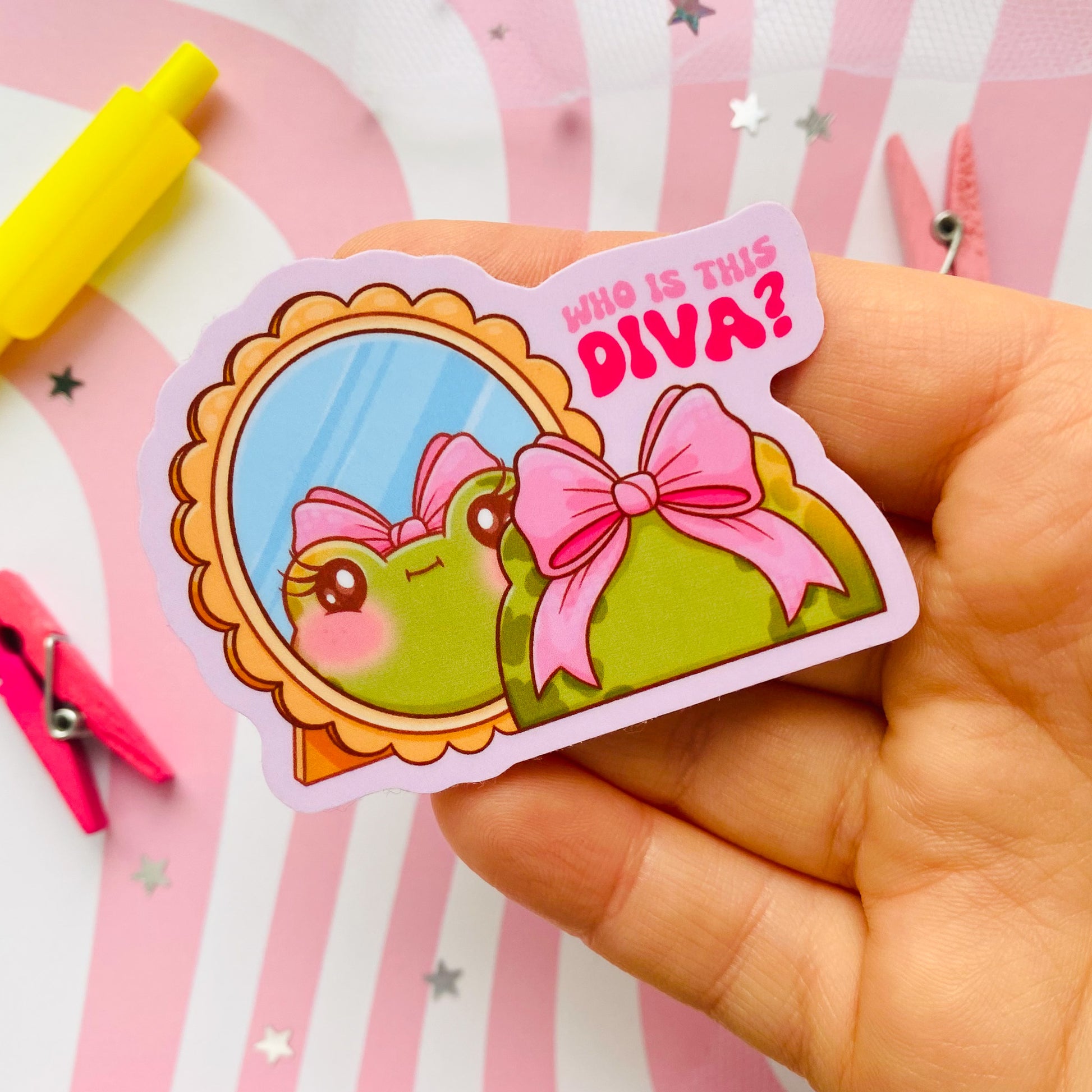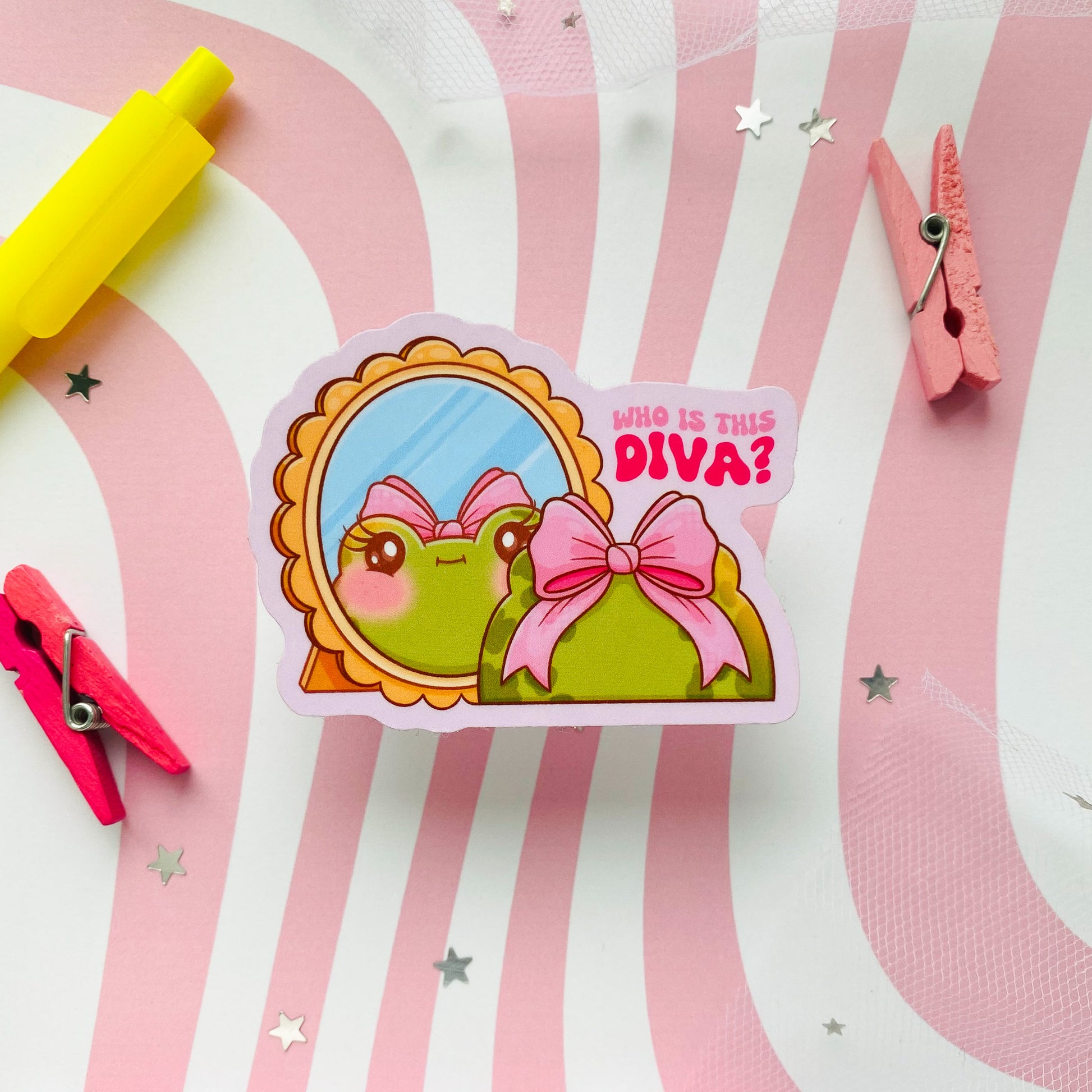 Channel your inner diva with this *Who Is This Diva* frog sticker, featuring a cute frog in front of a mirror—perfect for anyone who loves a little self-celebration in a playful way.